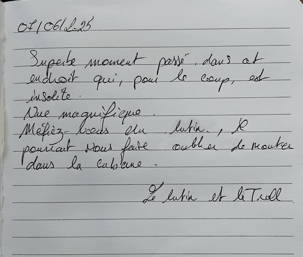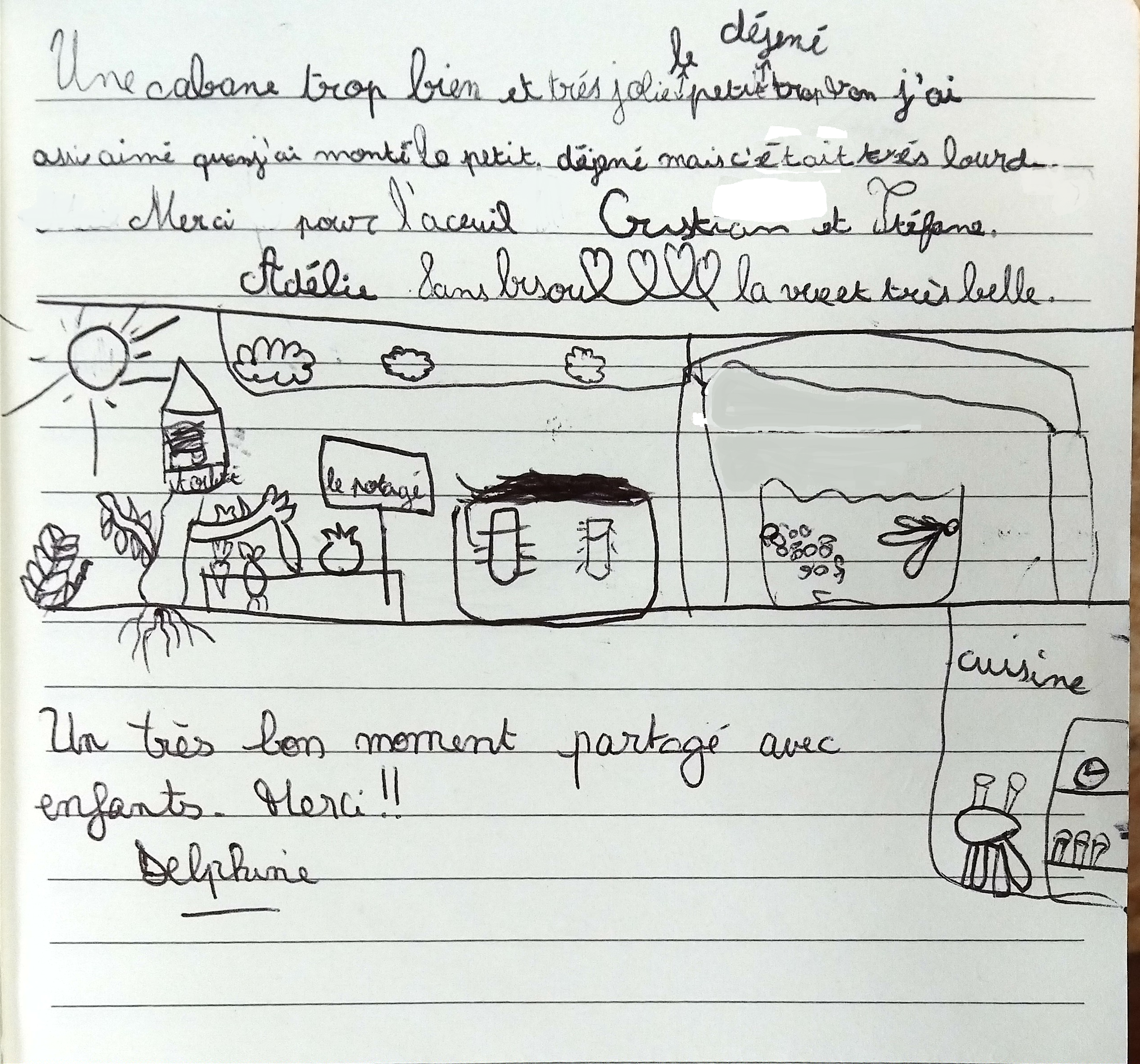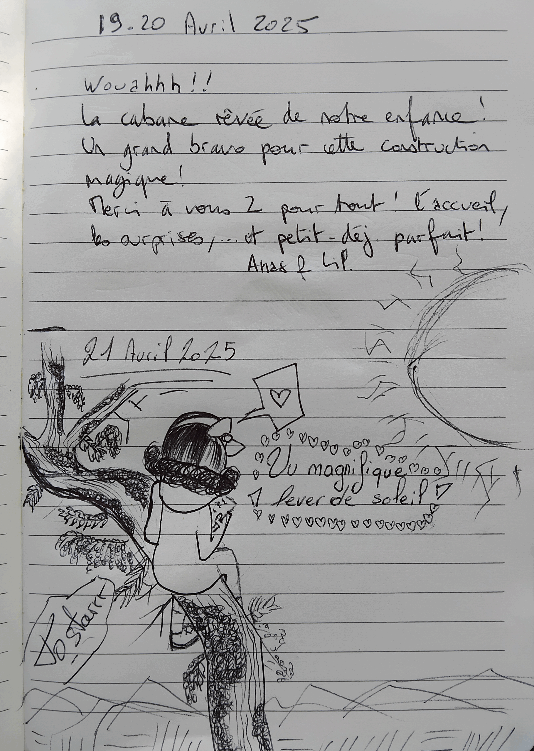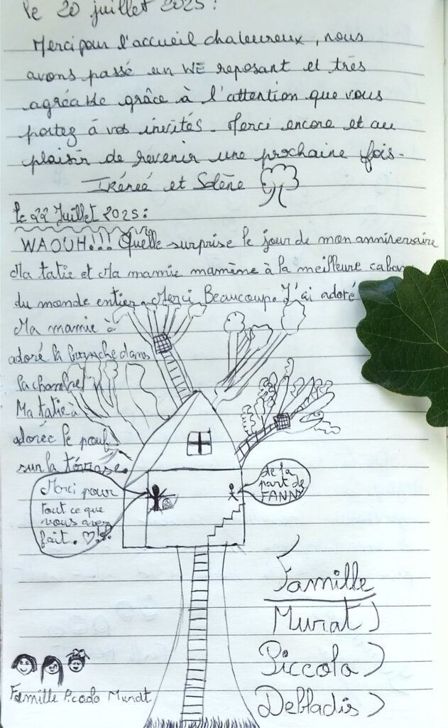 Merci à nos hôtes hyper sympas et accueillants. La cabane est géniale. Le petit déj trop top. L’escalade dans les arbres est une belle expérience. Nous avons eu la visite d’un petit écureuil. Merci pour tout, et à bientôt pour de nouvelles aventures. Cassandre ( 11 ans) et Mamie