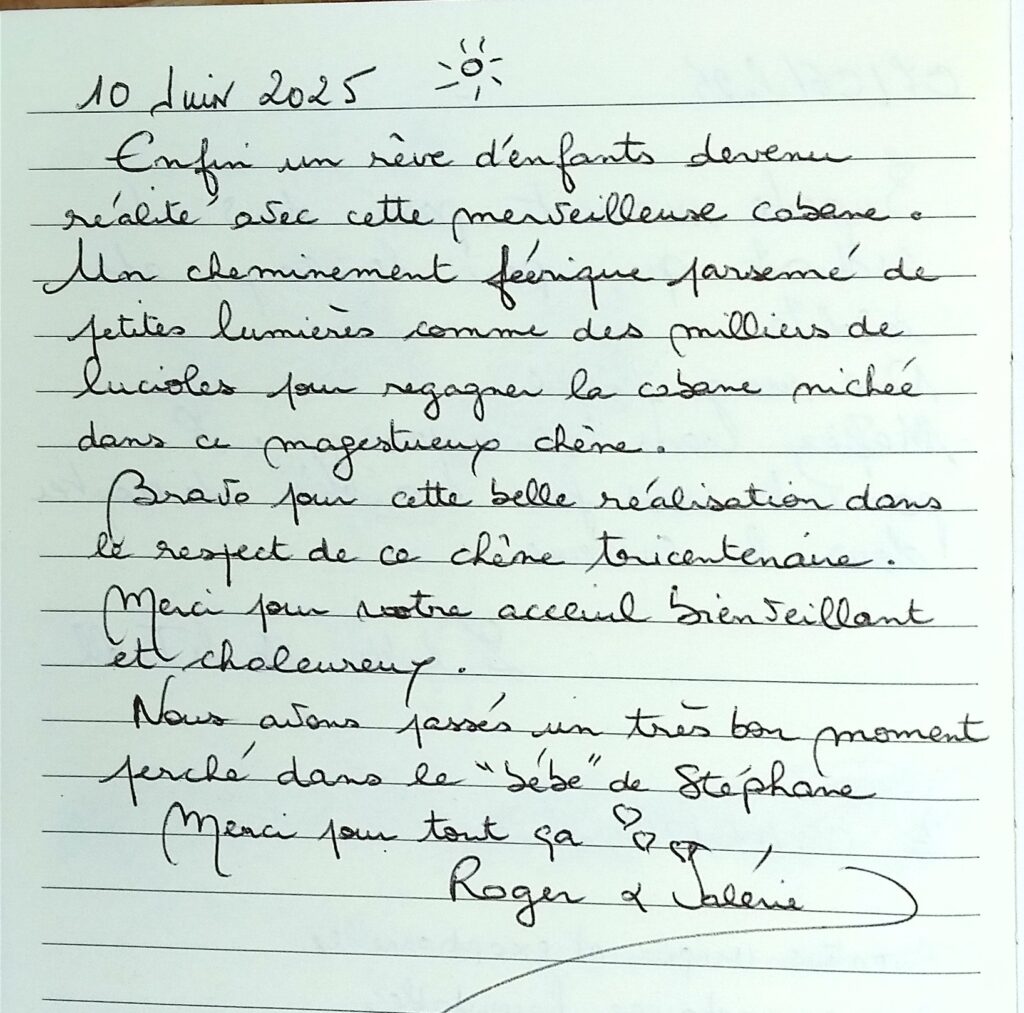 Vivre dans une cabane perchée dans un arbre , c’est un rêve d’enfant. Bien rares sont ceux qui se réalisent et encore plus rares sont ceux où la réalité surpasse l’imagination et toutes les attentes. Merci Stéphane et Christian pour votre accueil très chaleureux et d’avoir créé et de partager ce lieu féérique tout droit sorti de contes et légendes et qui nous entraine dans un autre monde, hors du temps. Le bruissement du vent dans les branches agitent le feuillage, le pépiement des oiseaux, le ballet des nuages, les gouttes de pluie tombant sur le toit puis au sol, faisant remonter les senteurs de la terre et des plantes. Cela donne envie d’y vivre toute l’année. Merci pour tout, je conserve précieusement l’adresse pour ma prochaine fois dans la région. JUSTIN de Colmar