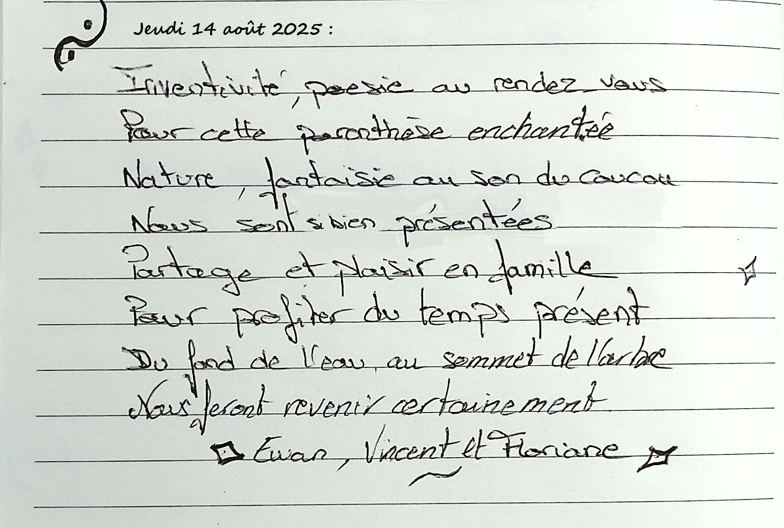 Chers Stéphane et Christian, merci pour tout ce que vous faîtes, pour votre gentillesse, votre sens du partage et cette magnifique volonté de donner du bonheur à vos visiteurs passagers. Merci pour la promenade dans la « Forêt oubliée »! JULIAN et LISA de Toulouse