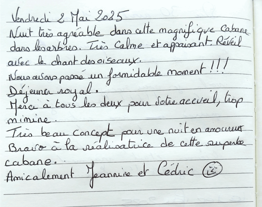 A very pleasant, warm and unforgettable moment, the tree house is very pleasant, we let ourselves be lulled by the song of the birds and the wind which brings us a breath of freshness. We will keep an excellent memory of the time spent. Thank you for all your little attentions! Jessica and Kévin (in imaginary country…)
