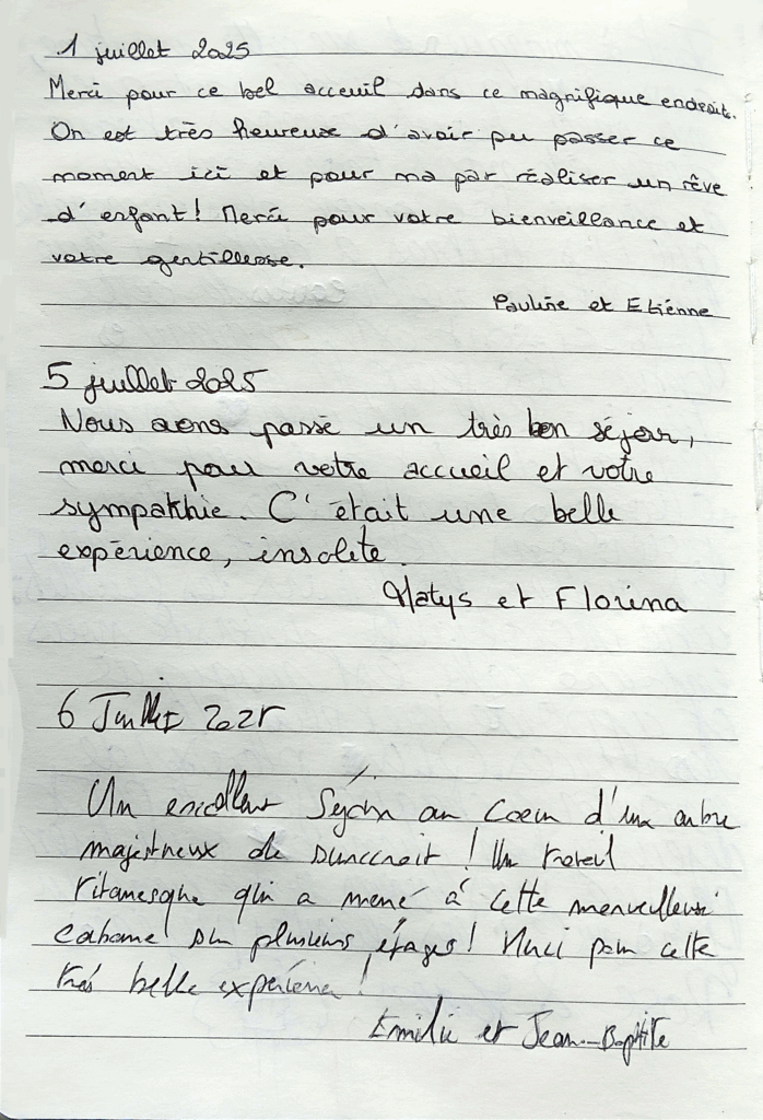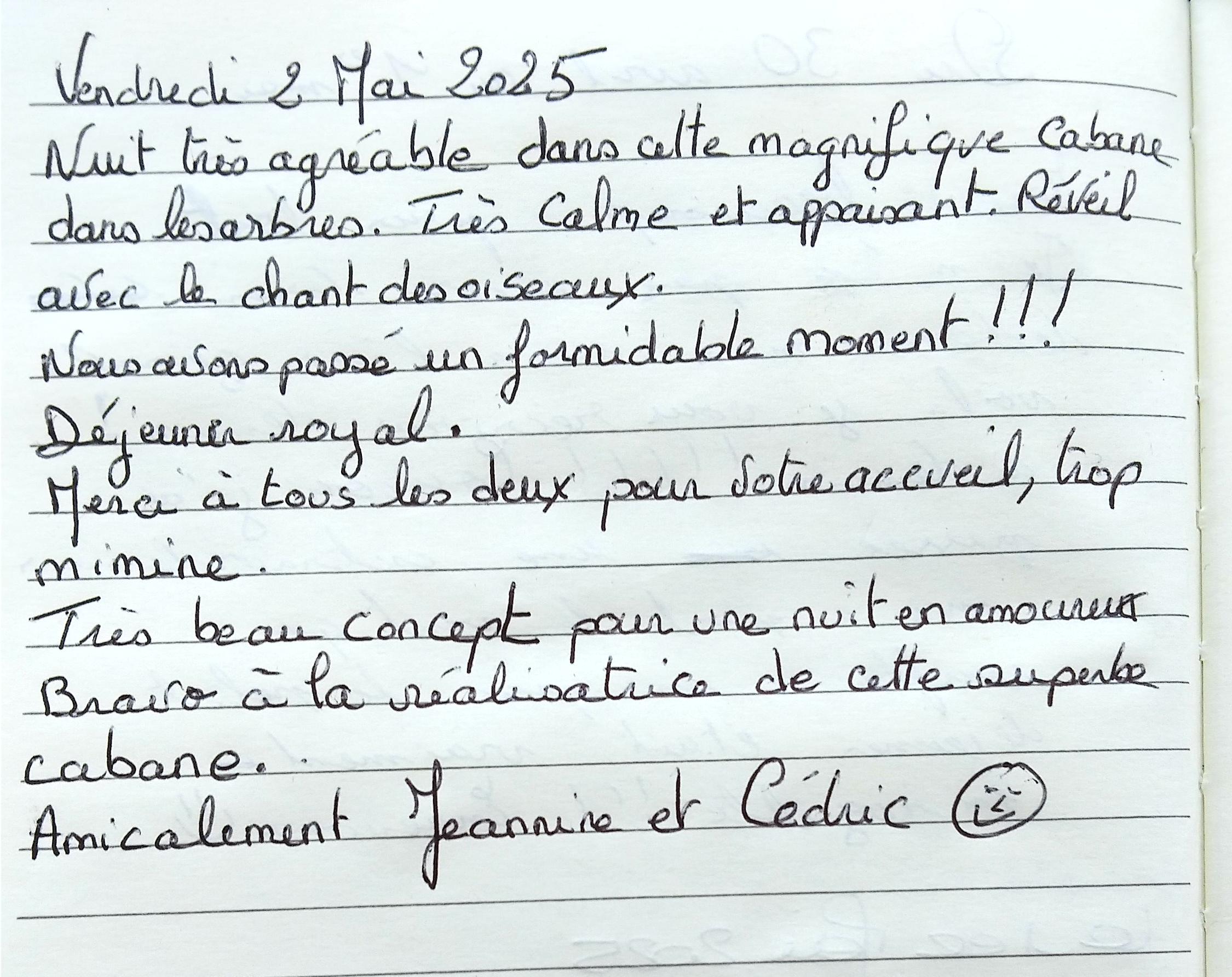 Un week-end magique, à 10 mètres de haut, un paradis dans les arbres! Un moment inoubliable et extraordinaire! Merci pour votre accueil, votre générosité et votre partage! Merci d’avoir fait de nos garçons deux petits singes, ils ont adoré! Merci pour cette parenthèse dans cette année si particulière. Nous avons été de surprise en surprise. Bonne continuation, Natalia, Nicolas. Merci, la cabane est magnifique, Enzo. Merci pour tout, Zack.