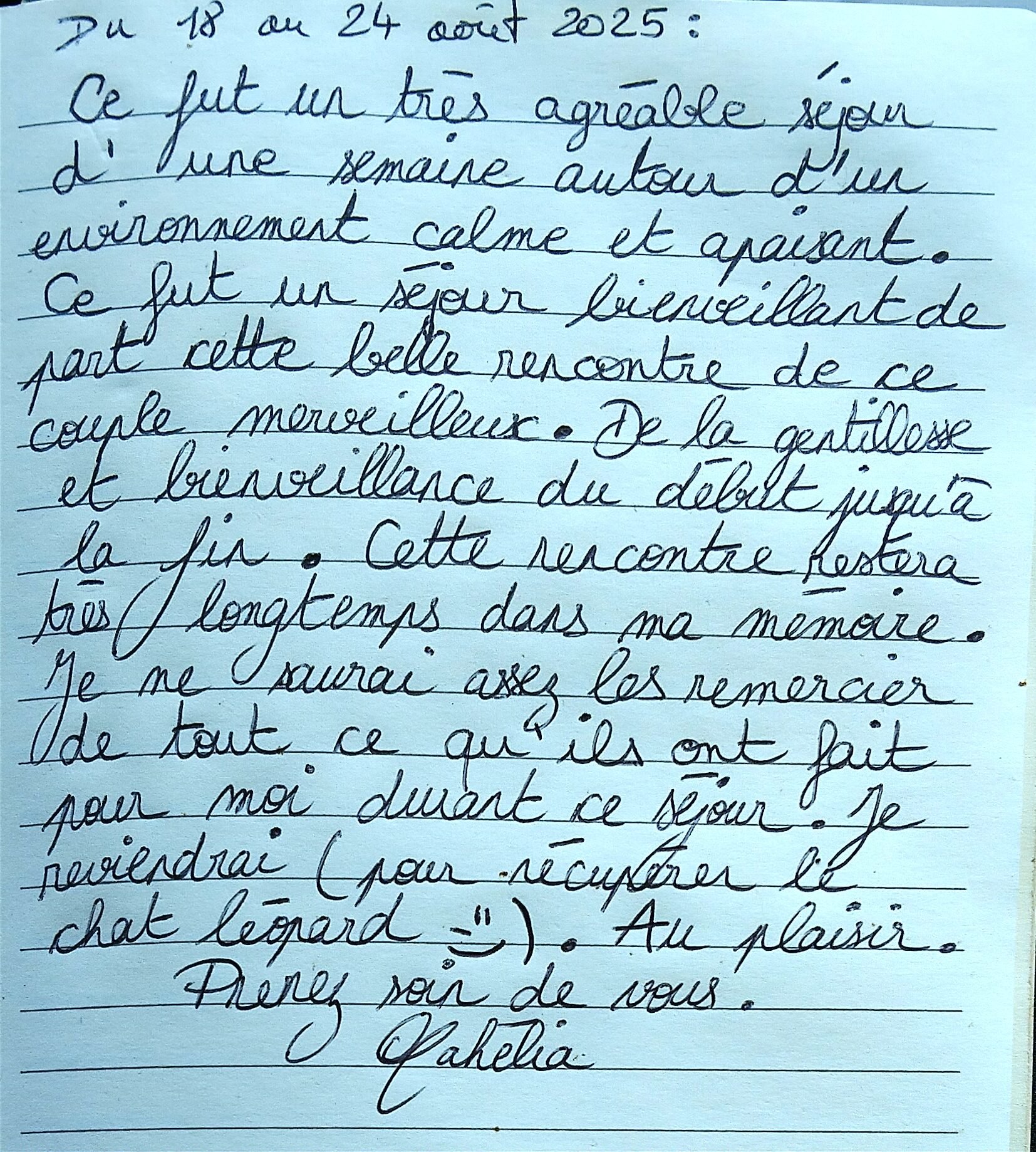 Merci à Mahélia pour son séjour d’une semaine, du 18 au 24 août 2025 :